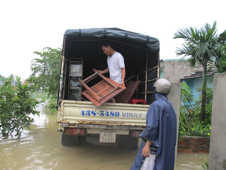 NGƯỜI DÂN BỊ NƯỚC NGẬP ÚNG VÂY HÃM Sáng 24-9, đường dây nóng Báo Công an TP Đà Nẵng nhận được điện thoại của chị Nguyễn Thị Phước, trú tổ 14 Hòa Minh, cho biết: Nhà chị bị nước tràn vào từ tối 23, sáng 24 vẫn chưa rút. Có mặt tại đây vào lúc 9 giờ sáng, chúng tôi không thể vào bên trong nhà chị Phước được, bởi đoạn đường vào nhà chị và các hộ dân nơi đây ngập úng rất sâu. Liên lạc qua điện thoại, chị cho biết, chồng đi công tác, hiện tại chị, con nhỏ và mẹ già đang bị nước ngập úng giam hãm. Sang tổ 12, chúng tôi chứng kiến cảnh vợ chồng công chức thuê trọ ở đây được 5 tháng đang chuyển đồ đạc ra xe tải để dời đi vì không thể ở được khi phải ngâm trong nước nhiều ngày liền.