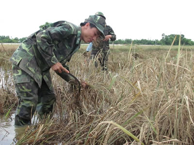 BĐBP Quảng Trị giúp dân thu hoạch lúa bị ngập úng. |