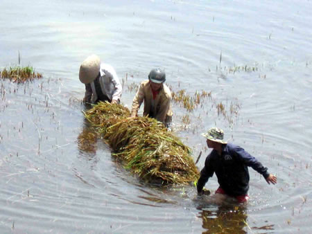 Nông dân Hòa Vang khẩn trương thu hoạch lúa phòng lũ lớn. Ảnh: V.H |