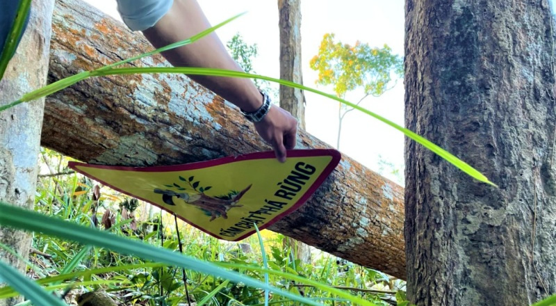 Một cây gỗ có gắn bảng “Cấm chặt phá rừng” tại khoảnh 3, Tiểu khu 64 bị “lâm tặc” đốn hạ. |