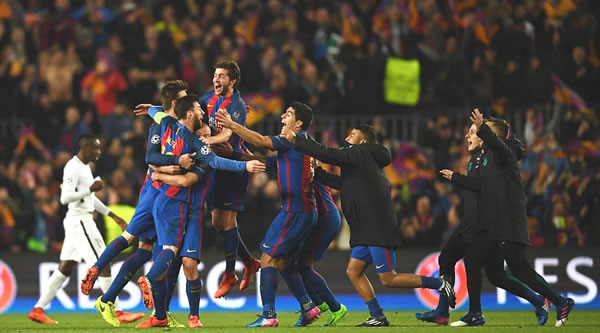 Lần đầu tiên trong lịch sử bóng đá Châu Âu có một đội bóng bị gác trước 4 bàn ở lượt đi vẫn lấy được vé đi tiếp. HLV Luis Enrique nói lời cảm ơn người hâm mộ xứ Catalan vẫn hoàn toàn tin tưởng vào đội bóng của ông để tới sân cổ vũ dù đã thua tới 0-4 ở lượt đi. Tới phút 62, PSG gỡ lại 1-3 với cú sút cực mạnh của Edinson Cavani. HLV PSG là Unai Emery nhảy cẫng lên ăn mừng bởi ông tin rằng Barcelona không thể ghi 3 bàn trong phần còn lại của trận đấu.