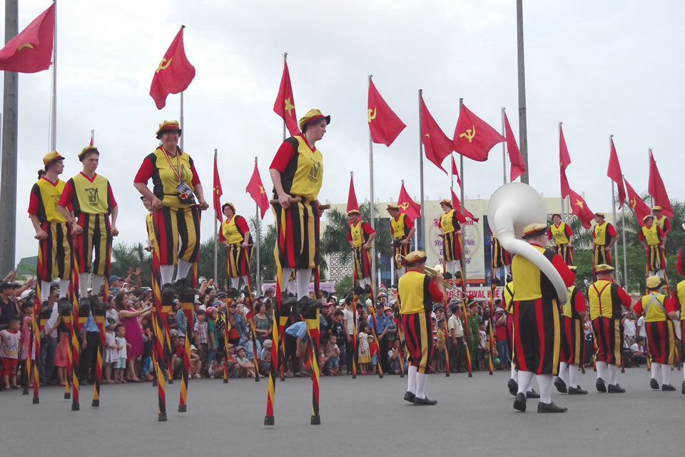 Lễ hội đường phố là một trong những chương trình gây ấn tượng cho người dân và du khách khi đến với Festival Huế 2018 (trong ảnh, đoàn cà kheo "De Steltenlopers van Merchtem" của Vương quốc Bỉ). |
