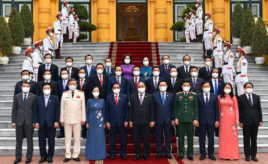 Chiều tối cùng ngày, tại Phủ Chủ tịch, Chủ tịch nước Nguyễn Xuân Phúc đã chủ trì Lễ Công bố và trao các Quyết định bổ nhiệm của Chủ tịch nước cho các thành viên Chính phủ nhiệm kỳ 2021-2026. Tại buổi lễ, Chủ tịch nước Nguyễn Xuân Phúc đã trân trọng trao các Quyết định của Chủ tịch nước về việc bổ nhiệm chức danh Phó Thủ tướng Chính phủ đối với các đồng chí: Phạm Bình Minh, Lê Minh Khái và Lê Văn Thành. Riêng Phó Thủ tướng Vũ Đức Đam đang chủ trì công tác phòng, chống dịch COVID-19 tại các tỉnh phía Nam nên không tham dự buổi Lễ. Chủ tịch nước cũng đã trao Quyết định bổ nhiệm các vị trí Bộ trưởng. Riêng Bộ trưởng Bộ Y tế Nguyễn Thanh Long đang bận chỉ đạo công tác phòng, chống dịch COVID-19 không tham dự buổi Lễ.
