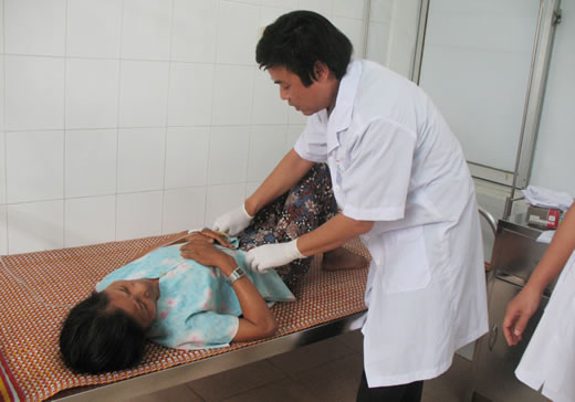 | Bác sĩ Phạm Văn Dũng - Phó Giám đốc TTYT NHS đang thăm khám bệnh nhân bị sốt mò. Ảnh: H.NHẬT |