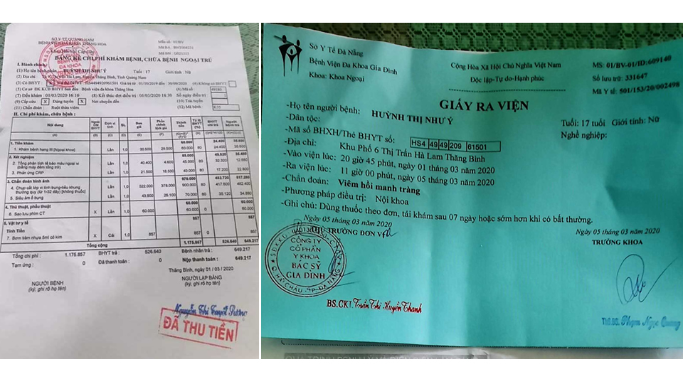 Các bác sĩ BVĐKTH chẩn đoán bệnh nhân Huỳnh Thị Như Ý bị viêm ruột thừa (ảnh trái) trong khi Bệnh viện Đa khoa Gia Đình ở Đà Nẵng chẩn đoán bị viêm hồi manh tràng (ảnh phải). |