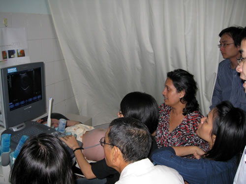 Các chuyên gia nước ngoài và đội ngũ bác sĩ BV Trường ĐH Y Dược Huế đang hội chẩn cho một thai phụ quê ở Quảng Nam. |