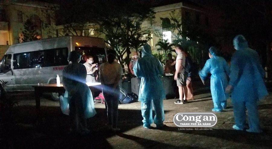 Lực lượng chức năng tiếp nhận các trường hợp người nước ngoài vào khu cách ly khuya 13-3. |