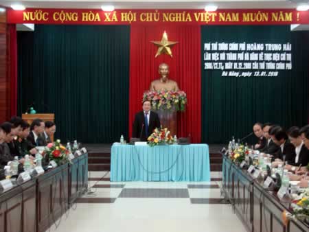 (Cadn.com.vn) - Ngày 13-1-2010, Đoàn công tác Chính phủ do đồng chí Hoàng Trung Hải, Phó Thủ tướng Chính phủ dẫn đầu đã đến kiểm tra tình hình thực hiện chỉ đạo của Thủ tướng Chính phủ về việc thực hiện các giải pháp thúc đẩy sản xuất kinh doanh (SXKD), bình ổn thị trường và phục vụ Tết Nguyên đán Canh Dần 2010 ở TP Đà Nẵng. Cùng đi có đại diện lãnh đạo Văn phòng Chính phủ và các bộ, ngành trung ương: Bộ Kế hoạch-Đầu tư, Bộ Công Thương, Bộ NN&PTNT, Bộ Tài chính, Bộ CA, Bộ Quốc phòng... Đoàn công tác đã có buổi làm việc với lãnh đạo UBNDTP Đà Nẵng và đại diện lãnh đạo các sở, ban, ngành TP.