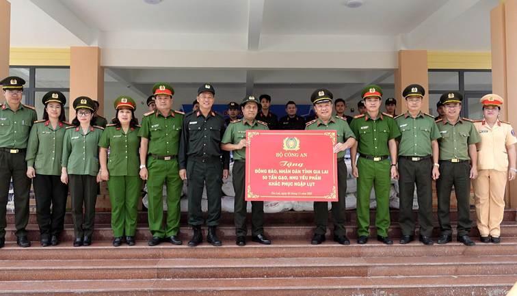Cũng trong sáng 26-11, tại Công an tỉnh Gia Lai, Đoàn công tác của Văn phòng Bộ Công an do Thiếu tướng Nguyễn Hồng Nguyên dẫn đầu đã trao 50 tấn gạo cùng nhiều nhu yếu phẩm cần thiết nhằm hỗ trợ người dân vùng lũ sớm vượt qua khó khăn và ổn định sinh hoạt.