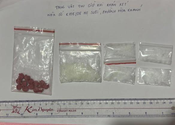 Tiến hành khám xét khẩn cấp nơi ở của Trần Thiện Phúc tại phòng số 4 nhà trọ số K108/08 Mẹ Suốt (phường Hòa Khánh), lực lượng chức năng phát hiện trong phòng trọ có đối tượng Nguyễn Thị Hằng (1996, trú tại phường Hải Vân, TP Đà Nẵng), qua khám xét thu giữ: 1 gói nilon bên trong có 13 viên nén; 8 gói nilon bên trong có chứa chất tinh thể rắn màu trắng; 1 cân tiểu ly điện tử cùng nhiều túi nilon có khóa zip và 1 bộ dụng cụ dùng để sử dụng ma tuý (Tổng trọng lượng số ma túy đã thu giữ khoảng 20g).