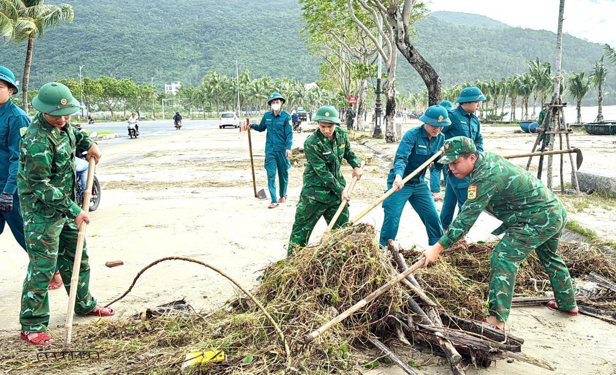 Cán bộ chiến sĩ chia thành nhiều nhóm thu dọn rác thải, xúc cát, vận chuyển cây cối đổ ngã. Không chỉ dọn dẹp ở khu vực bãi biển, lực lượng đoàn viên thanh niên còn dọn cát trên các tuyến đường biển để đảm bảo an toàn cho người dân khi lưu thông.