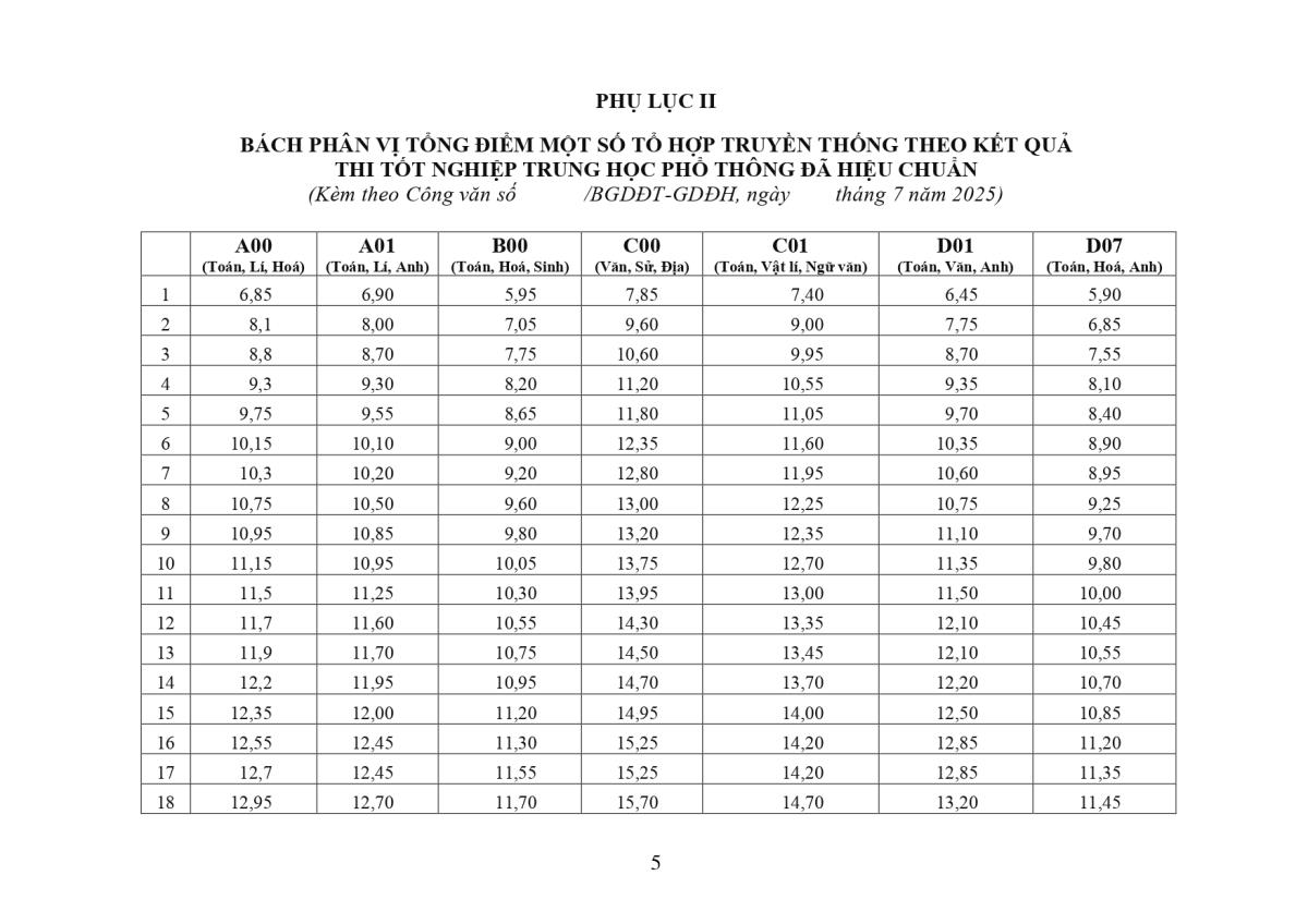 Phụ lục II là bảng bách phân vị tổng điểm một số tổ hợp phổ biến của kỳ thi tốt nghiệp THPT năm 2025 sau khi được hiệu chuẩn.