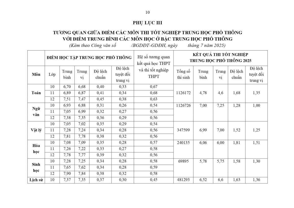 Phụ lục III là tương quan giữa điểm thi tốt nghiệp THPT năm 2025 và điểm trung bình các môn học ở bậc THPT. (Kèm theo các phụ lục dưới đây).
