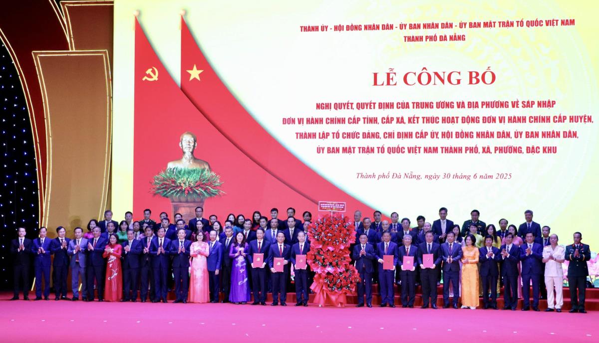 Ngày 30-6, Thành ủy, HĐND, UBND, Ủy ban MTTQ Việt Nam TP Đà Nẵng tổ chức Lễ công bố nghị quyết, quyết định của Trung ương và địa phương về sáp nhập đơn vị hành chính cấp tỉnh, cấp xã, kết thúc hoạt động đơn vị hành chính cấp huyện; thành lập tổ chức Đảng, chỉ định cấp ủy, HĐND, UBND, Ủy ban MTTQ Việt Nam thành phố, xã, phường, đặc khu.