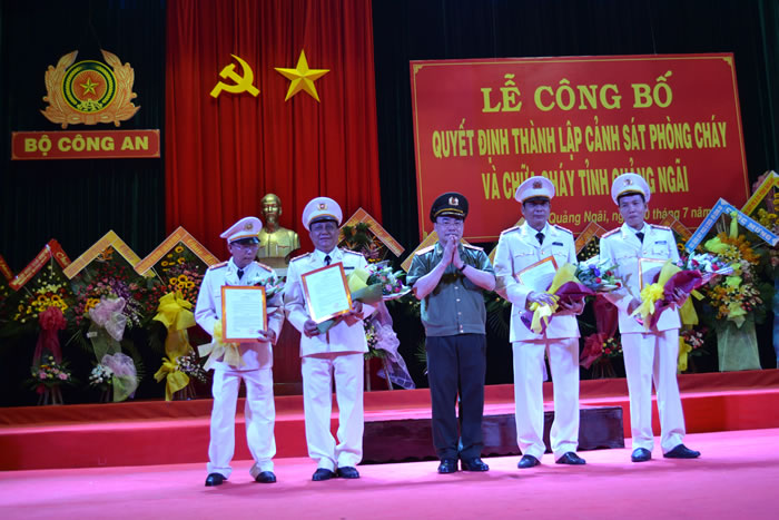 Sáng cùng ngày, Thứ trưởng Bùi Quang Bền công bố quyết định thành lập Cảnh sát phòng cháy, chữa cháy (CSPCCC) tỉnh Quảng Ngãi; trao quyết định giữ chức vụ Giám đốc CSPCCC tỉnh Quảng Ngãi đối với Đại tá Võ Đức Nguyện - Phó Giám đốc CA tỉnh; trao quyết định giữ chức vụ Phó Giám đốc cho 3 đồng chí và 10 đồng chí lãnh đạo cấp phòng thuộc CSPCCC tỉnh Quảng Ngãi.