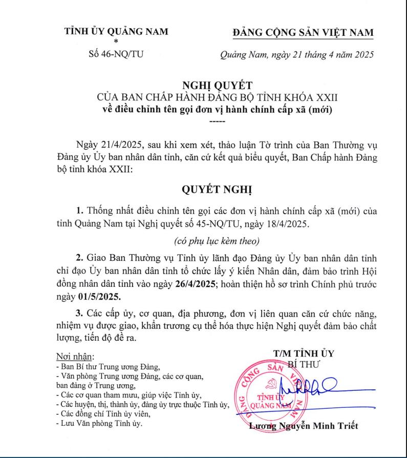 Sau khi xem xét, thảo luận Tờ trình số 130-TTr/TU ngày 22-4-2025 của Ban Thường vụ Thành ủy, căn cứ kết quả biểu quyết, Ban Chấp hành Đảng bộ thành phố khóa XXII quyết nghị thống nhất điều chỉnh tên gọi của đơn vị hành chính cấp xã hình thành sau sắp xếp tại Nghị quyết số 25-NQ/TU ngày 15-4-2025 của Thành ủy.
