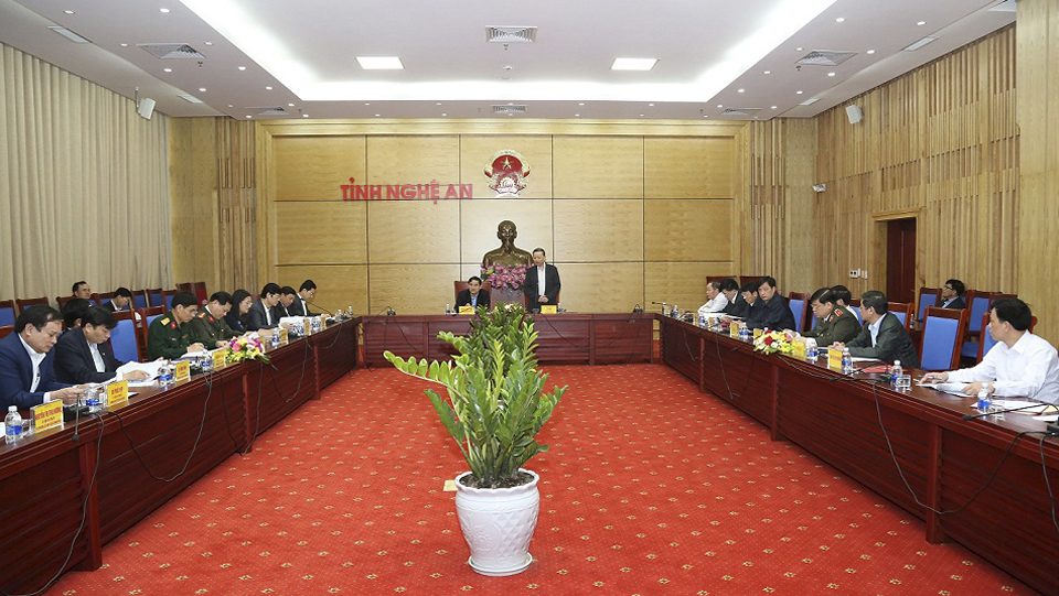 Tại buổi làm việc, đại diện lãnh đạo tỉnh Nghệ An đã thông báo với Đoàn công tác về tình hình phát triển kinh tế- xã hội và tình hình an ninh, trật tự (ANTT) trên địa bàn trong thời gian qua. Theo đó, tỉnh Nghệ An đã hoàn thành xuất sắc các chỉ tiêu đề ra, với tốc độ tăng trưởng kinh tế đạt 8,28%, 27/27 chỉ tiêu về kinh tế - xã hội đạt và vượt, tổng thu ngân sách trong năm đạt gần 12.500 tỷ đồng… Các lĩnh vực văn hóa, giáo dục, cải cách hành chính cũng được quan tâm và đạt được nhiều thành tựu. Mặt trận quốc phòng- an ninh được giữ vững, tạo điều kiện thu hút đầu tư phát triển kinh tế địa phương. An ninh biên giới, vùng biển được đảm bảo, đặc biệt trong năm đã hoàn thành xuất sắc diễn tập phòng thủ cấp tỉnh, cấp huyện; giải quyết tốt các vấn đề về tôn giáo, tạo sự đoàn kết trong quần chúng nhân dân…