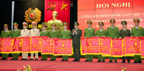 Thứ trưởng Bộ CA Bùi Văn Nam trao Cờ thi đua của Bộ CA cho Thiếu tướng Nguyễn Văn Sơn, Giám đốc CATP Đà Nẵng và CA các đơn vị. |