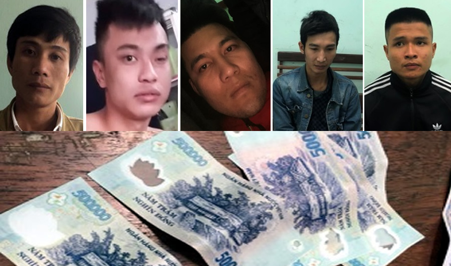 Từ trái qua, các đối tượng: Bắc, Kiên, Tường, Nam, Đức và số tiền giả bị thu giữ. |