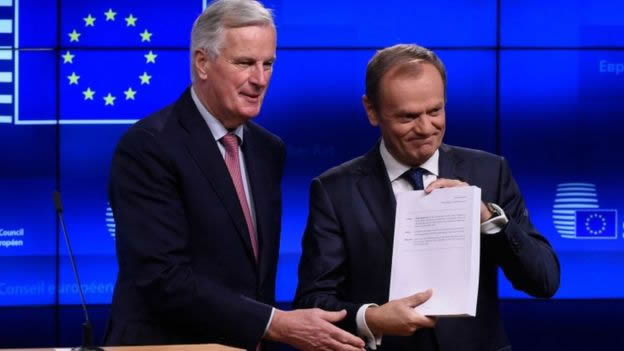 Ông Michel Barnier (trái) - người đứng đầu đoàn đàm phán Brexit của EU - chính thức giao dự thảo thỏa thuận cho người đứng đầu Hội đồng Châu Âu (EC) Donald Tusk. Ảnh: AFP |
