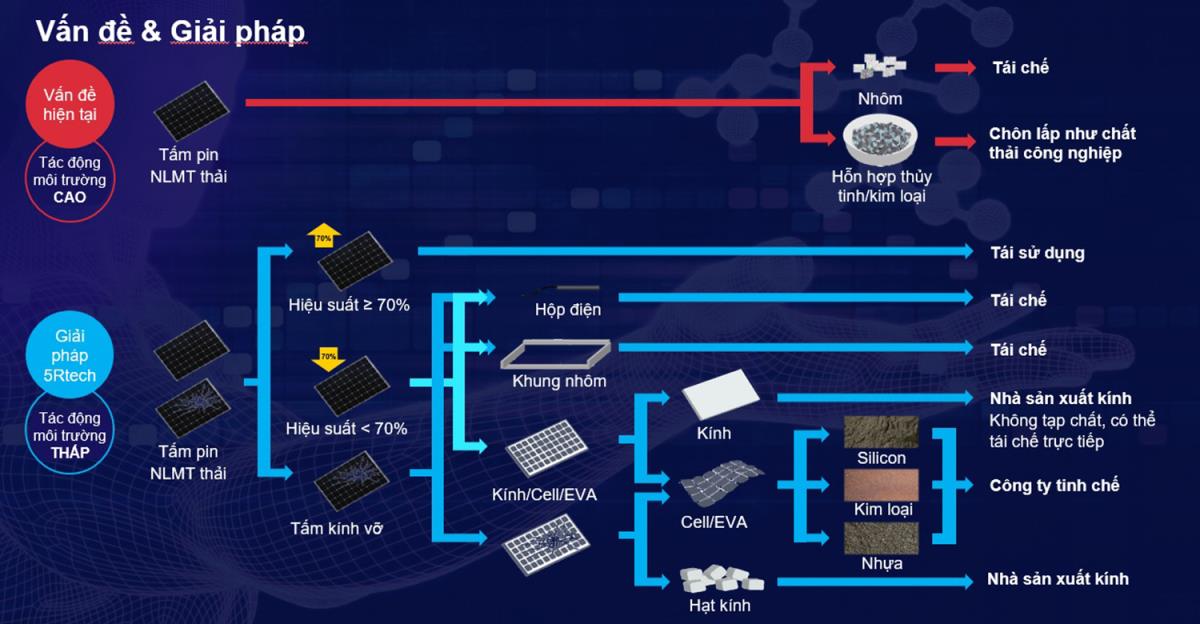 Trước thực trạng đó, nhóm nghiên cứu của Trường ĐHBK Đà Nẵng đã phát triển thành công công nghệ tái chế hoàn toàn không dùng hóa chất, giúp xử lý hiệu quả các kim loại nặng độc hại như chì, cadmium, wolfram... từ các tấm pin hỏng.Theo đó, chi phí tái chế một tấm pin là khoảng 500 ngàn đồng, trong khi vật liệu thu hồi có giá trị từ 150.000–200.000 đồng. Từ 300 tấm pin đã qua sử dụng, nhóm đã thu được 750 kg nhôm, 60 kg kim loại quý, 900 hộp điện và dây dẫn, cùng 7 tấm kính lớn có thể tái sử dụng ngay. Không chỉ mang lại giá trị vật chất, công nghệ này còn góp phần đáng kể vào giảm thiểu phát thải khí nhà kính. Ước tính, việc tái chế giúp cắt giảm khoảng 1,2 tấn CO2 cho mỗi 1 MW điện, so với phương pháp chôn lấp truyền thống – vốn gây ô nhiễm lâu dài cho đất và nước. Đặc biệt, phần kính cường lực còn nguyên vẹn có thể được tận dụng để sản xuất vật liệu xây dựng, kính dân dụng hoặc các ứng dụng công nghiệp khác. Hiện tại dự án đang xây dựng chuỗi tái chế khép kín cùng các doanh nghiệp (DN), để tận dụng tối đa giá trị từ rác thải pin mặt trời.