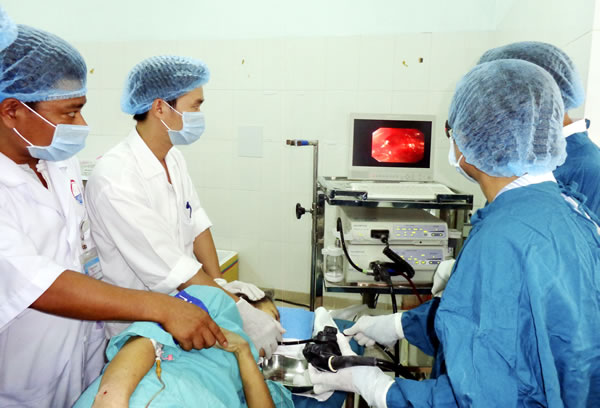 (Cadn.com.vn) - QUẢNG TRỊ - Ngày 8-8, BVĐK tỉnh Quảng Trị tiếp nhận kỹ thuật nội soi can thiệp tiêm keo sinh học điều trị xuất huyết tiêu hóa do giãn tĩnh mạch trướng phình vị ở người bệnh xơ gan, ung thư gan từ các bác sĩ chuyên về nội soi của BVT.Ư Huế chuyển giao. Đây là kỹ thuật chuyên sâu tiên tiến hàng đầu hiện nay trong điều trị chảy máu tiêu hóa do giãn tĩnh mạch phình vị ở người bệnh xơ gan có thể dẫn tới tử vong.
