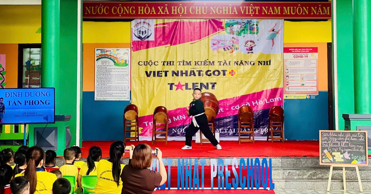 Ghi nhận thực tế tại Trường mầm non Việt Nhật - cơ sở Thăng Bình (33A đường Trần Phú, xã Thăng Bình, thành phố Đà Nẵng) vào sáng 25-4, các bé được tham gia sân chơi "Viet Nhats Got talent - Tài năng nhí Việt Nhật năm 2026". Điểm khác biệt của chương trình là trẻ được tự do thể hiện tài năng của mình thông qua nhiều nội dung khác nhau như âm nhạc, kể chuyện, ca hát, võ thuật, vẽ tranh, lắp ghép mô hình, tô màu, múa nghệ thuật… Nhiều trẻ tự tin thể hiện phần thi tài năng bằng ngôn ngữ tiếng Anh như ca hát hay kể chuyện với sự tham gia chấm điểm của giáo viên nước ngoài.