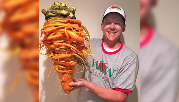 Chris Qualley, 34 tuổi, trồng được củ cà rốt khổng lồ với hình thù kỳ lạ trong vườn nhà anh tại bang Minnesota, Mỹ. Củ cà rốt khổng lồ có trọng lượng 10,2kg và được cho là củ cà rốt nặng nhất thế giới hiện nay. Kỷ lục người trồng được cà rốt lớn nhất thế giới hiện tại đang thuộc về Peter Glazebrook ở Anh. Người đàn ông này đã được ghi vào sách kỷ lục thế giới Guinness năm 2014 với củ cà rốt nặng 9 kg.