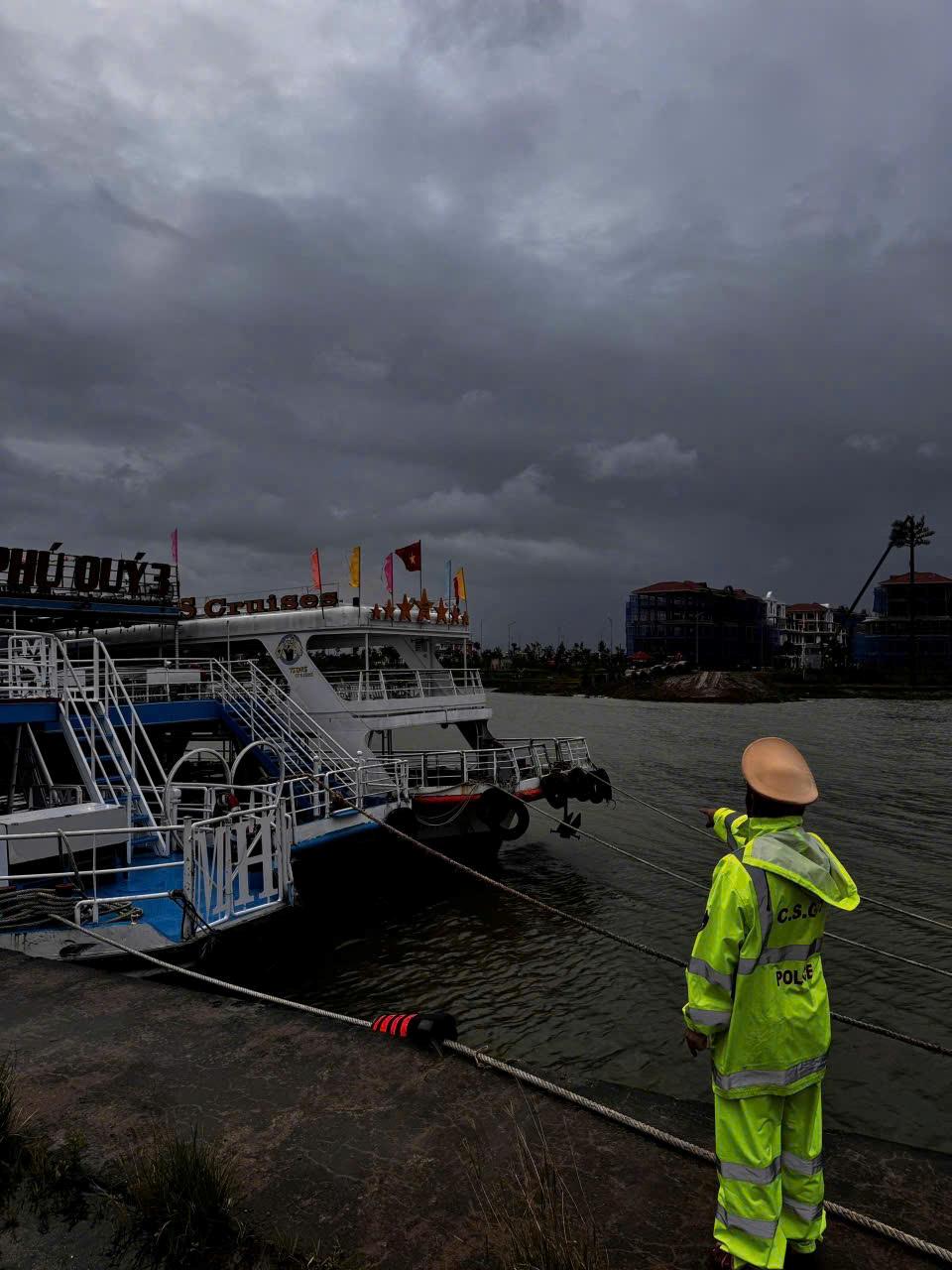 Tính đến chiều tối 22-10, công tác phòng chống, ứng phó với bão đã được triển khai khẩn trương, đồng bộ trên các mặt. Trong khi lực lượng CSGT đường bộ tổ chức tuần tra, kiểm soát 24/24 tại các khu vực có nguy cơ cao xảy ra ngập úng, sạt lở, lũ quét… vừa để kịp thời hỗ trợ, hướng dẫn người dân, vừa tăng cường tuyên truyền, nhắc nhở người dân chủ động theo dõi diễn biến của bão giúp đảm bảo an toàn khi tham gia giao thông thì lực lượng Cảnh sát đường thủy cũng phối hợp với các đơn vị chức năng liên hệ, kêu gọi tàu thuyền vào nơi trú tránh an toàn, hướng dẫn sắp xếp neo đậu hợp lý, giảm thiểu rủi ro khi bão đổ bộ. Tại khu vực sông Cổ Cò có 112 tàu; khu vực Âu thuyền Thọ Quang 833 tàu; khu vực Cửa Đại 491 tàu; khu vực Kỳ Hà 582 tàu đã được lực lượng CSGT cùng với các lực lượng chức năng như BĐBP, chính quyền địa phương sắp xếp neo đậu.