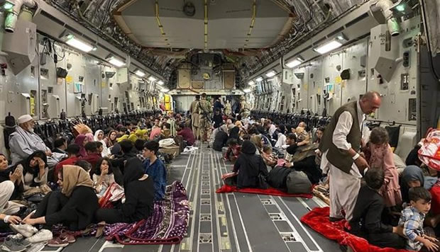 Người dân Afghanistan bên trong một máy bay quân sự Mỹ, chuẩn bị được sơ tán khỏi sân bay quốc tế ở Kabul hôm 19-8. Ảnh: AFP |