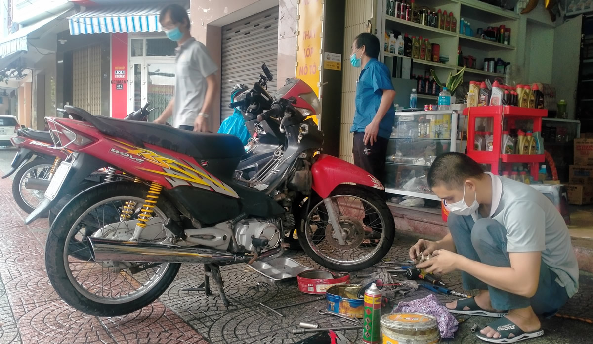 Ngày đầu hoạt động trở lại, các tiệm sửa xe tại Đà Nẵng thu hút khá đông người dân đến sửa chữa xe máy. |