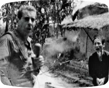 Ký giả Morley phỏng vấn một người dân Cẩm Nê, trong khi nhà vẫn cháy sau lưng. |