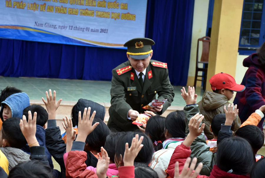 Đại úy Phạm Hoàng Hồng Minh tặng quà cho trẻ em vùng cao H. Nam Giang. |