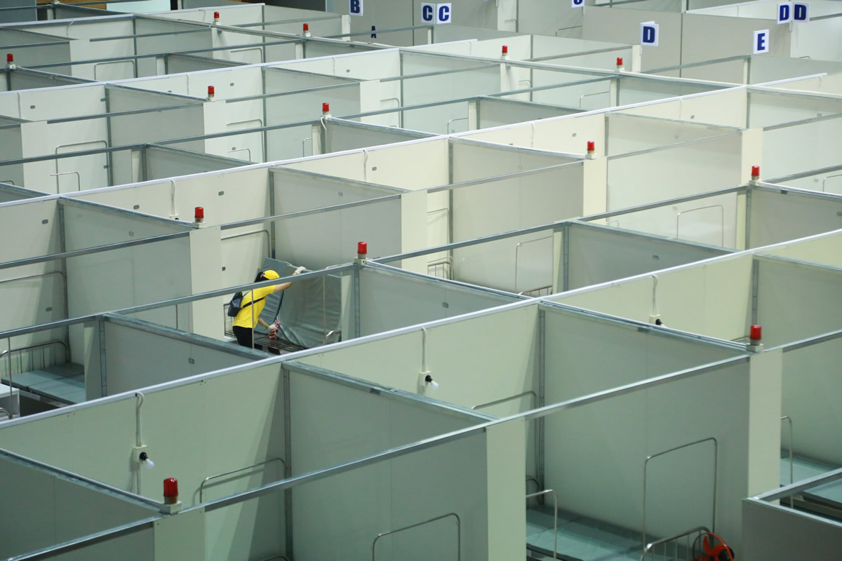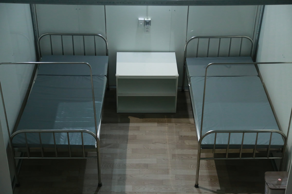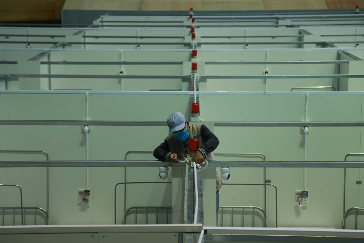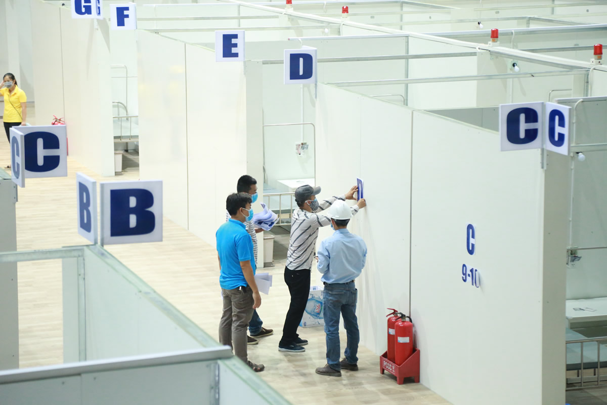 Hàng trăm công nhân được huy động, khẩn trương xây dựng bệnh viện dã chiến từ ngày 2-8. Bệnh viện dã chiến được xây dựng bằng các vật liệu nhẹ, ngăn cách bằng vách ngăn.