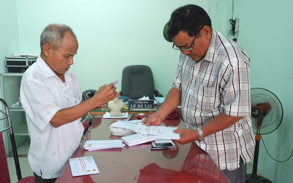 Ông Phan Văn Tải, ông Lê Bá Lai soạn thư mời gửi cho CBCS từng hoạt động Quận nhì về dự lễ B1 Hồng Phước đón nhận danh hiệu AHLLVTND. |