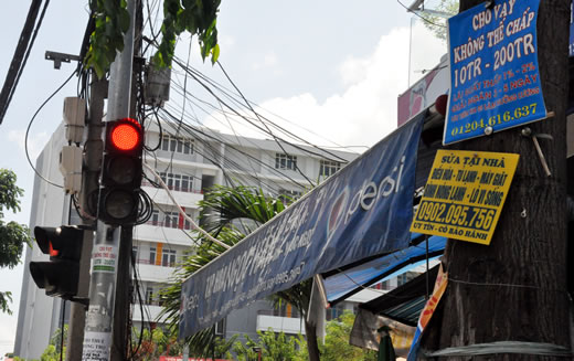Tương tự tại các bức tường rào, tuyến phố cũng chứng kiến đủ thứ quảng cáo rao vặt như: khoan cắt bê-tông, hút hầm cầu, bán nhà đất,... được dán tràn lan gây mất mỹ quan đô thị... Nghiêm trọng hơn, tại hầu hết các ngã ba, ngã tư có đèn tín hiệu giao thông, thường xuyên diễn ra tình trạng một vài người len lỏi vào dòng người, xe dưới lòng đường để phát tờ rơi không chỉ làm phiền người tham gia giao thông, tiềm ẩn nguy cơ tai nạn mà còn gây mất mỹ quan đô thị.