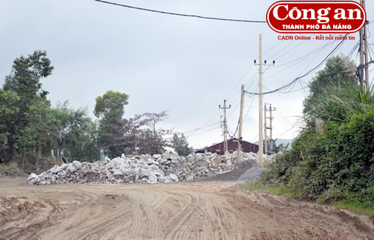 Đá đã chế biến và đá nguyên liệu của Cty Nho Chiến tập kết chắn ngang một số tuyến đường đang thi công. |