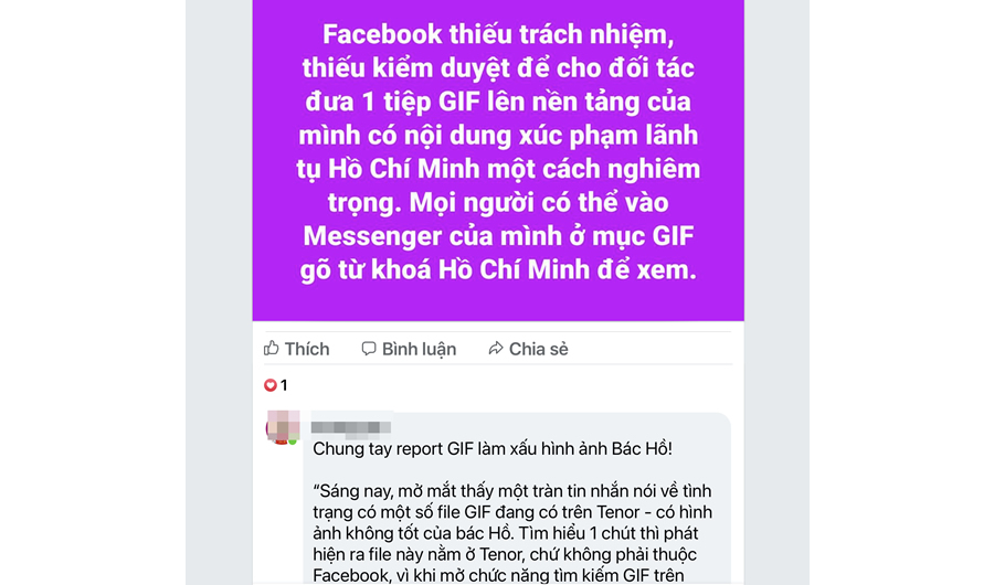 Mấy ngày nay, dư luận Việt Nam phẫn nộ khi ứng dụng cung cấp hình ảnh động (GIF) trên Facebook cung cấp một tập tin GIF chứa chân dung của Chủ tịch Hồ Chí Minh bị bóp méo. Nhiều người dùng mạng xã hội Facebook đã bức xúc nhấn nút report (báo cáo) hình ảnh này cho nhà sản xuất.