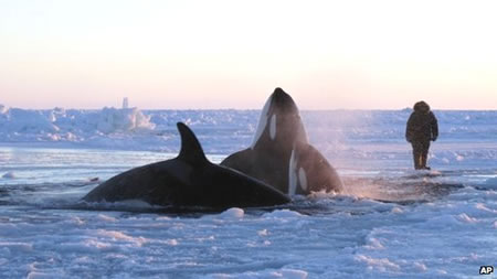 Những con cá voi bị mắc kẹt trong băng. Ảnh: AP |