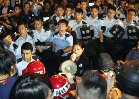 Reuters dẫn lời cảnh sát cho biết đã bắt giữ 45 người biểu tình, sử dụng bình xịt hơi cay nhằm vào những người chống đối, khi họ giải tán một con đường chính bị chặn bởi những người biểu tình ủng hộ dân chủ với các tấm bê-tông. Trong đoạn phim phát sóng trên đài truyền hình TVB, một số cảnh sát đánh và đá một người biểu tình bị còng tay trong vài phút sau khi kéo anh ta đến góc tối cạnh địa điểm biểu tình.