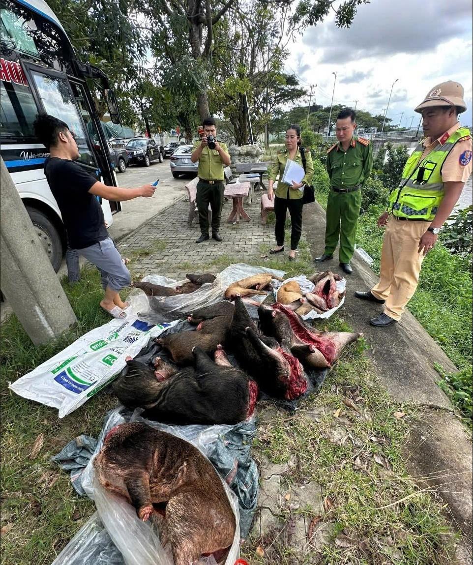 Tại hiện trường, tổ tuần tra phát hiện trên xe đang vận chuyển nhiều thùng xốp, bao tải chứa thịt động vật đông lạnh, gồm: 11 cá thể cầy đông lạnh (nghi là cầy mực thuộc nhóm động vật rừng nguy cấp, quý, hiếm); 6 cá thể động vật đông lạnh không đầu, không chân, lông màu đen, chưa xác định được chủng loài, nghi là heo rừng; cùng 3 cá thể động vật đông lạnh không đầu, không chân, lông màu vàng, chưa xác định được chủng loài.