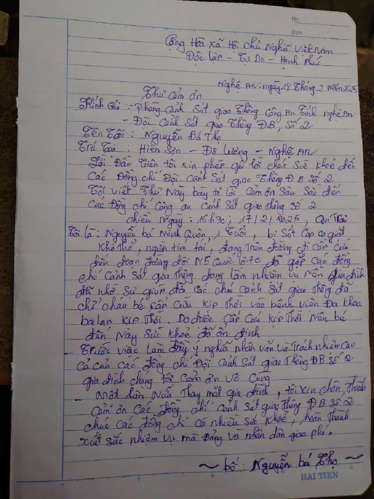 Tuy nhiên, với tinh thần cứu người là trên hết, cháu bé được đưa đến bệnh viện cấp cứu kịp thời và đã qua cơn nguy kịch. Cảm kích về hành động của các cán bộ chiến sỹ CSGT, anh Nguyễn Bá Thọ (1985, bố cháu bé, trú tại xóm Văn Phú, xã Hiến Sơn, huyện Đô Lương) đã viết thư cảm ơn. Trong thư có đoạn “nhờ sự giúp đỡ các chú Cảnh sát giao thông đã chở con tôi cấp cứu kịp thời…, gia đình tôi cảm ơn vô cùng. Chúc các đồng chí có nhiều sức khỏe, hoàn thành xuất sắc nhiệm vụ mà Đảng và Nhân dân giao phó”…