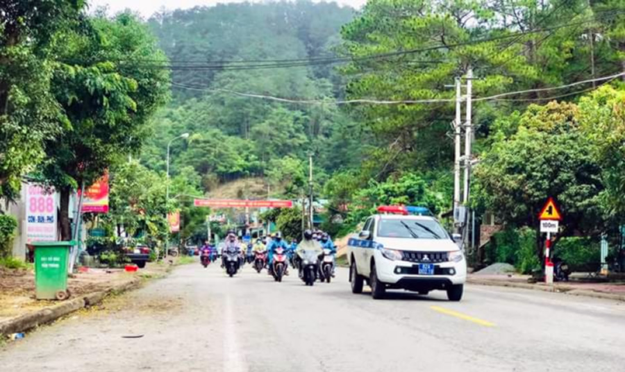 Cảnh sát giao thông dùng xe chuyên dụng dẫn đường cho một đoàn người về quê. |