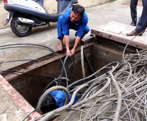 Công nhân ngành VT Đà Nẵng kéo cáp ngầm phục vụ khách hàng. |