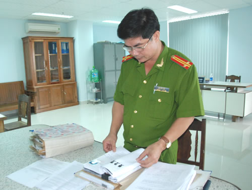 | Trung tá Nguyễn Giới - Đội trưởng Đội Điều tra thẩm định hồ sơ tố tụng - Văn phòng Cơ quan CSĐT CATP Đà Nẵng kiểm tra hồ sơ về hành vi lừa đảo của Linh và My. |