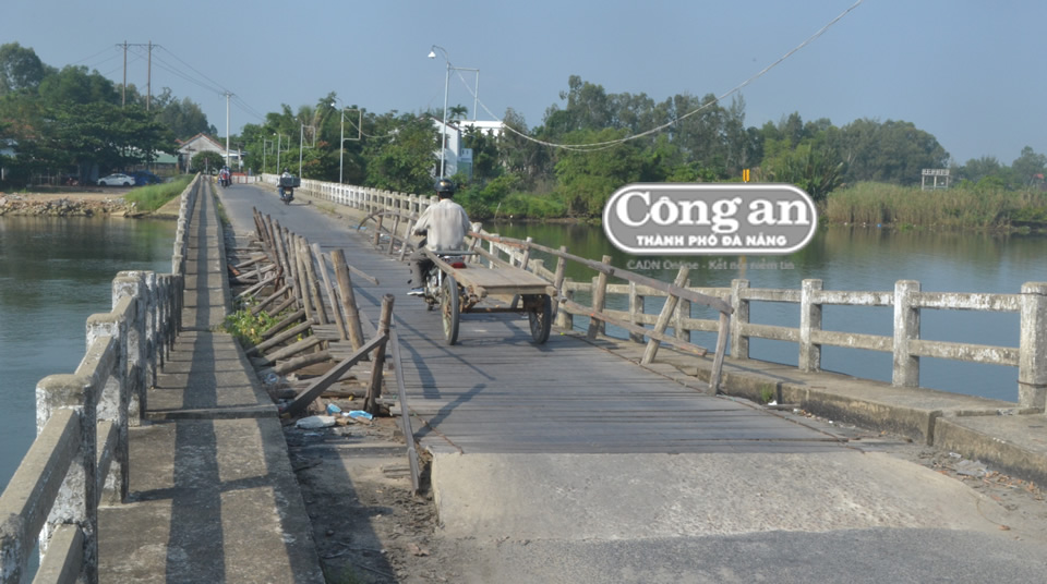 Cầu Hà Tân bị gãy, UBND xã Duy Vinh đành phải bắc cầu tạm trên chính nhịp cầu Hà Tân để người dân đi lại tạm thời, dù biết không an toàn. |