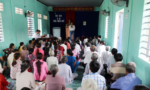 | Đằng sau tập luyện dưỡng sinh của CLB dưỡng sinh Huế là chữa bệnh (trong ảnh: lớp dưỡng sinh do CLB Trường sinh học Huế mở ở xã Điền Môn). |