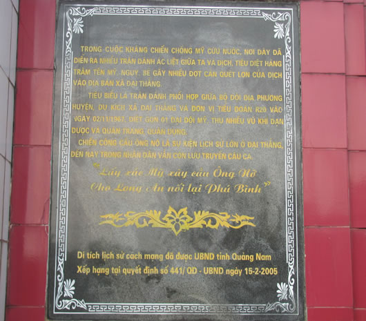 Ngày ấy, hai thôn Long An và Phú Bình nối nhau bằng chiếc cầu tre lắt lẻo băng qua lạch nước rộng chừng 10 mét. Hai bên cầu là cánh đồng trống trải, rất ít mái nhà tranh lúp xúp dưới những rặng tre ở khá xa cầu. Ngày 22-6-1967, Trung đoàn 51 lính thủy đánh bộ Mỹ đổ quân mở đợt càn quét với quy mô lớn các xã vùng B Đại Lộc. Nhận định quân Mỹ sẽ triển khai lực lượng hành quân từ xã Đại Cường qua xã Đại Thắng, Đại đội trưởng Đại đội 1, Tiểu đoàn R20, tỉnh đội Quảng Đà Huỳnh Đức Công, người con anh hùng của P.Hòa Hiệp Nam, Q.Liên Chiểu, Đà Nẵng đã trực tiếp lên phương án và chỉ huy trận phục kích địch.