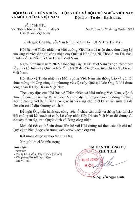 Trước đó ngày 29-8, Hội đồng Cây Di sản Việt Nam đã họp, xét duyệt hồ sơ và kết luận cây Quế nóc Ông Ní đã đạt đầy đủ các tiêu chí là Cây Di sản Việt Nam. “Hội Bảo vệ Thiên nhiên và Môi trường Việt Nam xin thông báo và gửi lời chúc mừng tới địa phương về việc cây Quế đã được công nhận là Cây Di sản Việt Nam”- thông báo thể hiện.