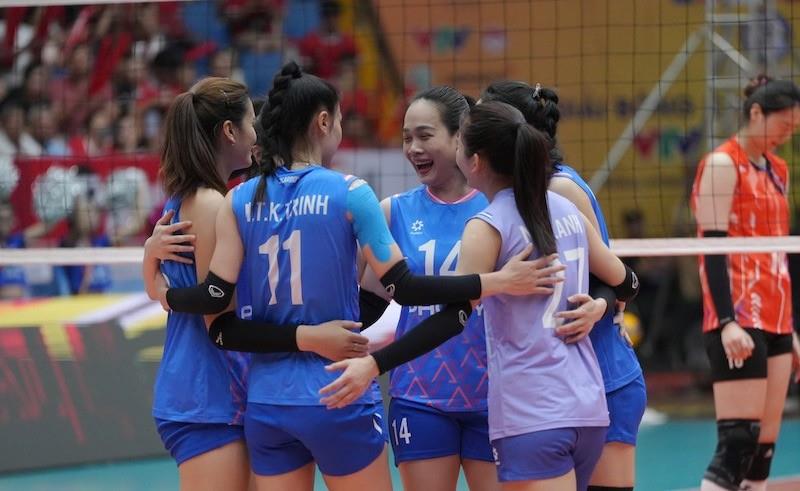 Bích Tuyền (trái ăn mừng cùng đồng đội sau chiến thắng lịch sử của tuyển nữ bóng chuyền Việt Nam trước Thái Lan (Ảnh: Asean Urbanit).